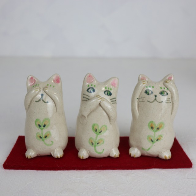 見にゃい、言わにゃい、聞かにゃい、の三猫の置物です。赤い毛氈つき。 高さ6.5×横約12.5m