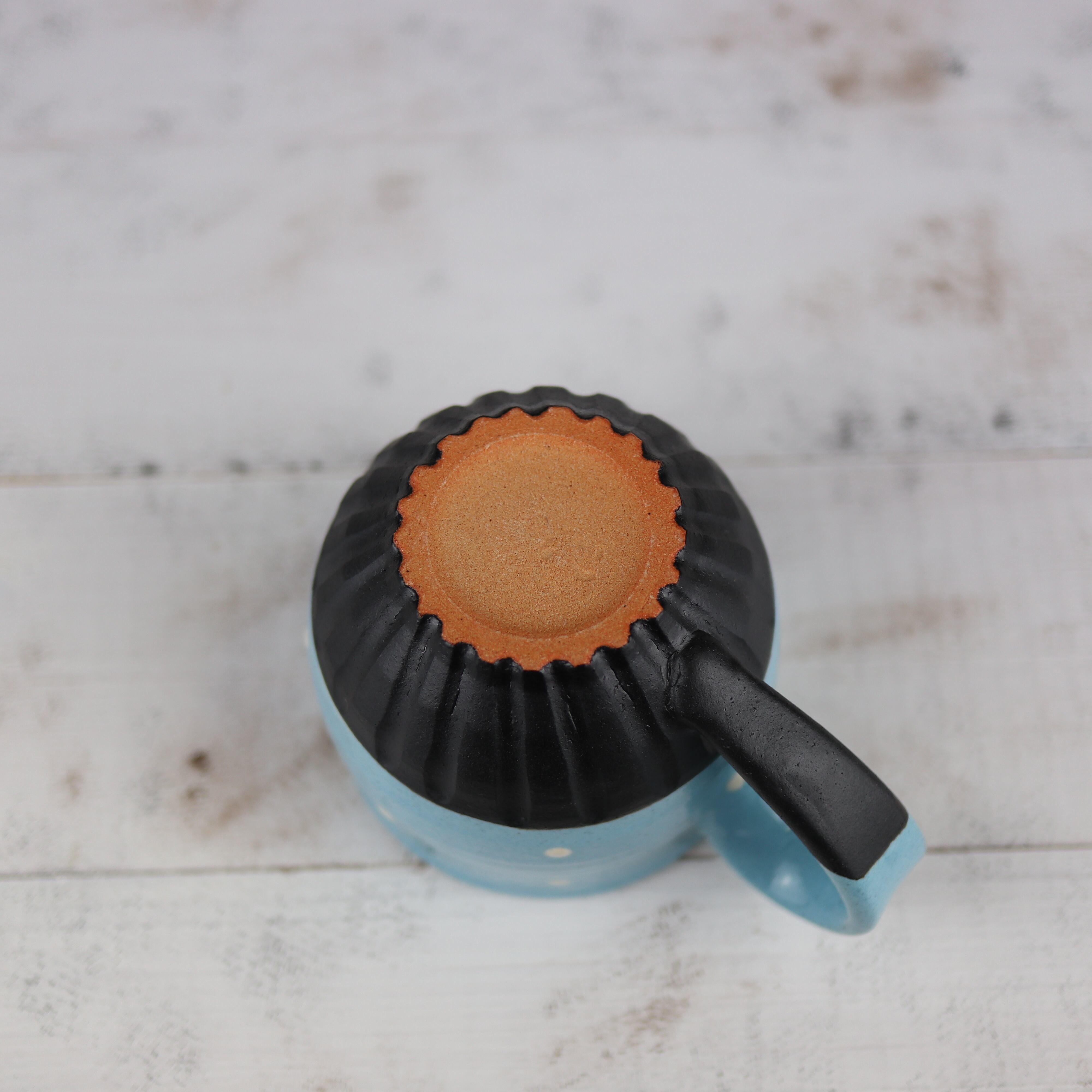 水色の化粧に黒の釉薬を掛けあわせドットを施したマグカップです。軽くて取っ手も持ちやすいです。八分目まで入れて、230ml入ります。