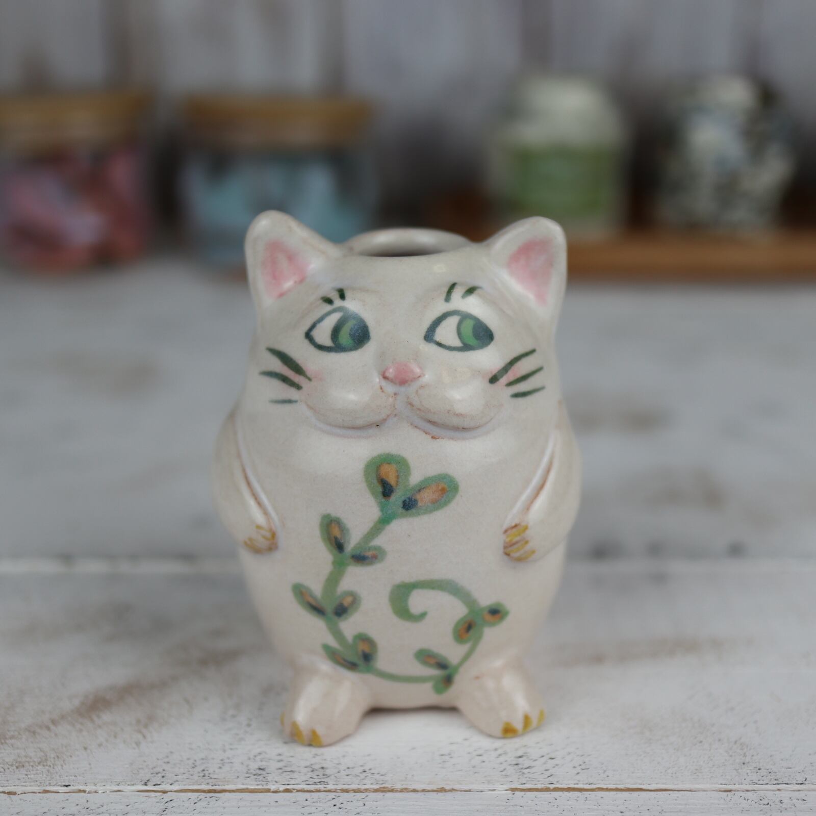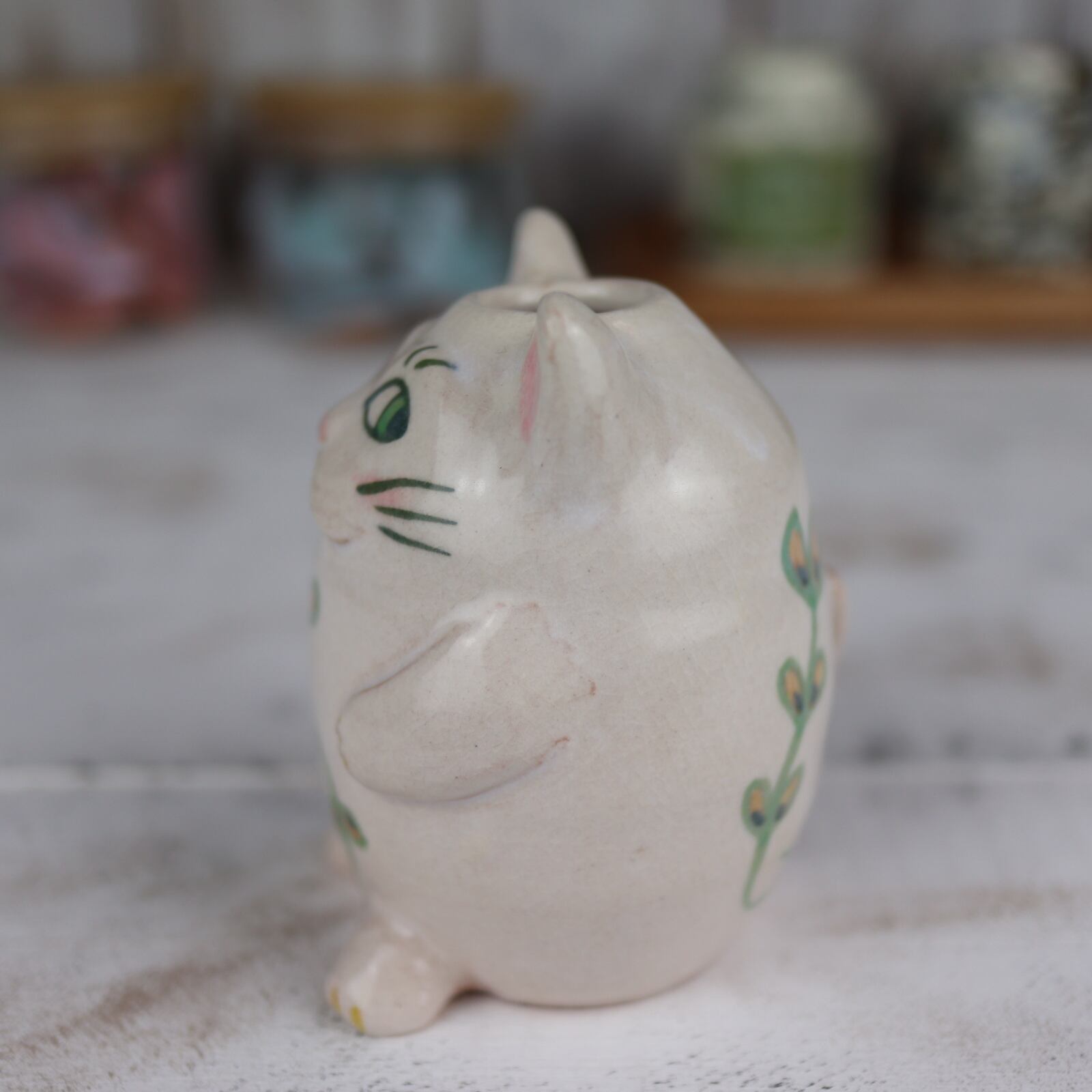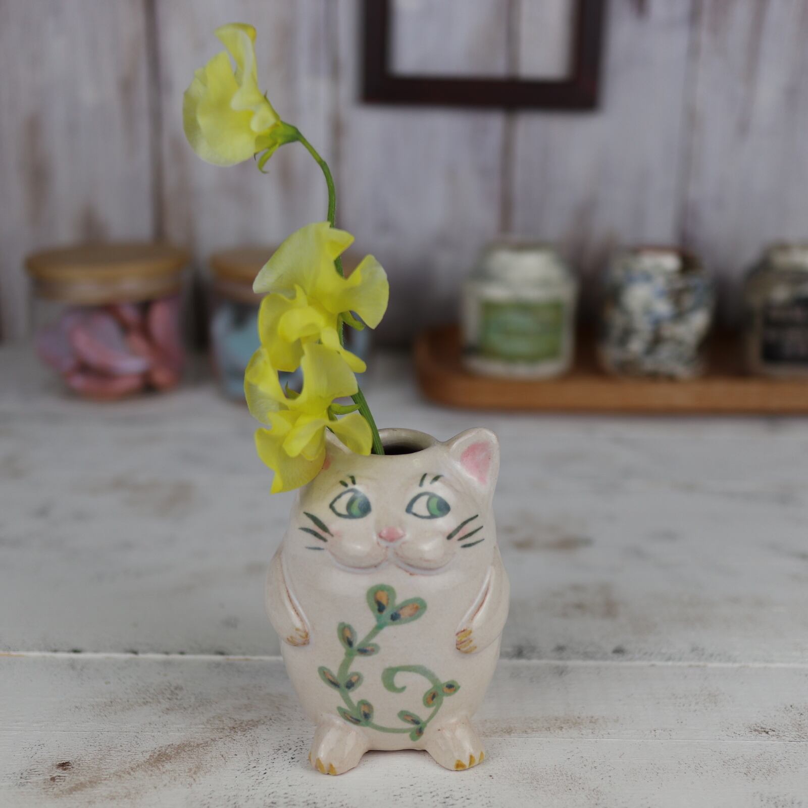 猫の花入れです。頭の天辺に穴が空いていて、お花がいけられます。