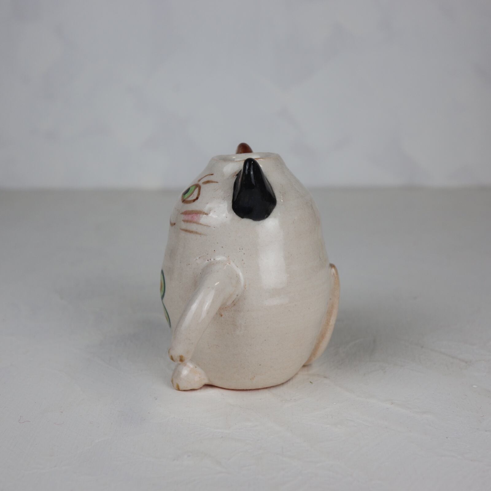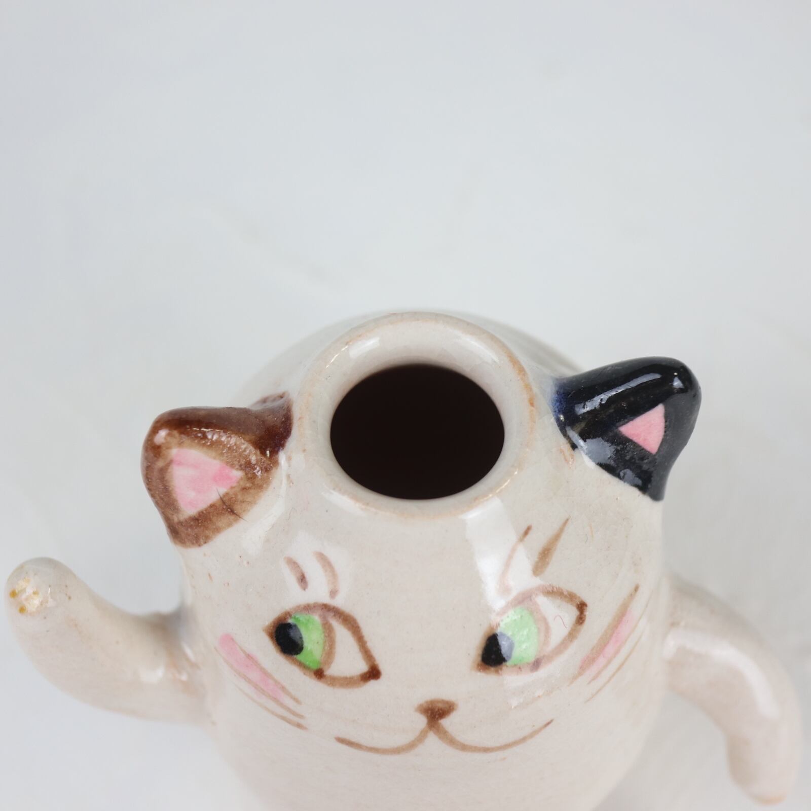 かわいい猫のミニ花入れです。ハニワのポーズが可愛らしいです。頭の天辺にお花が生けられます。ペン立てとしてもどうぞ。
