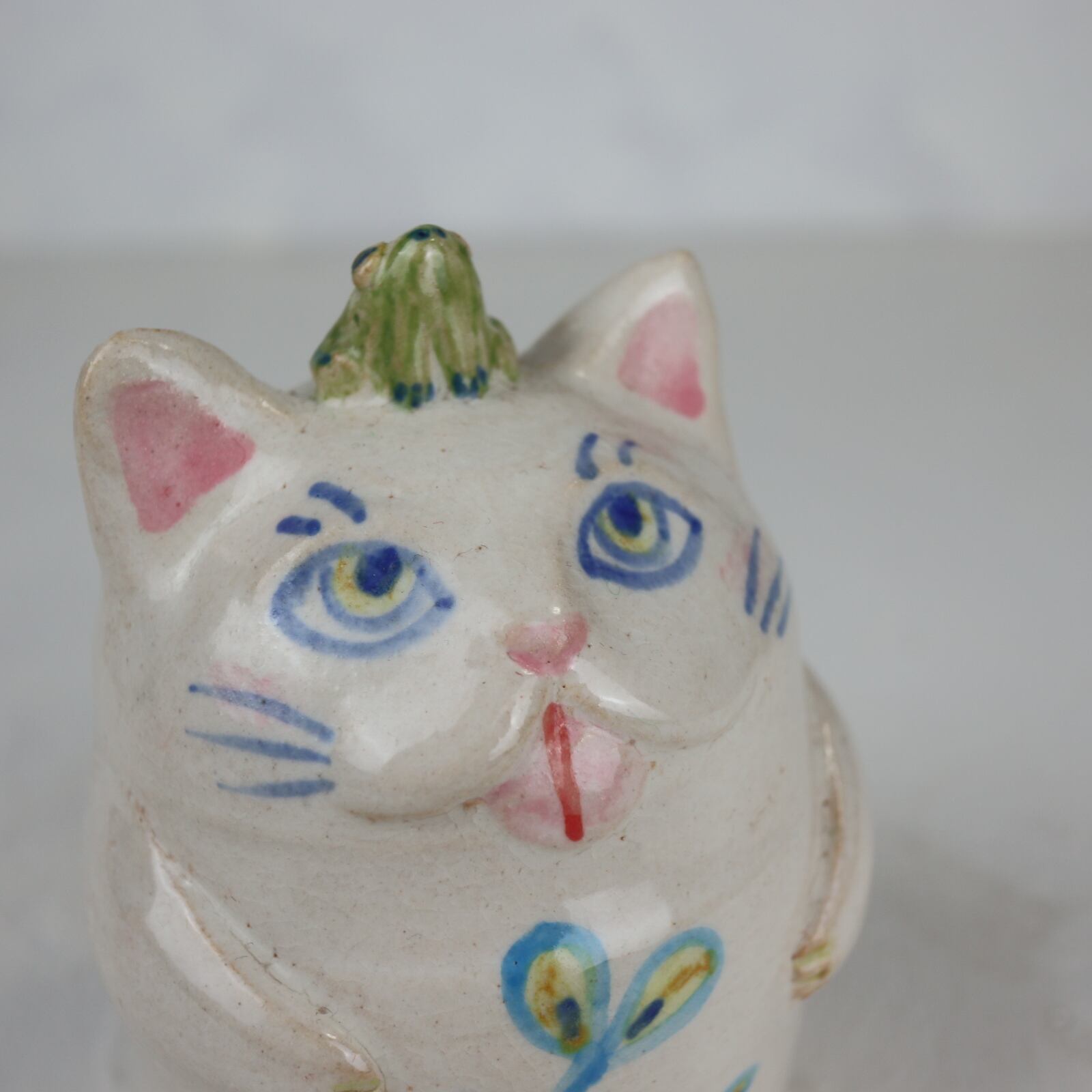 カエルを頭にのせた猫の貯金箱です。シッポはヘビで猫とカエルとヘビの三竦みです。底に穴が空いていて、ゴムもついています。