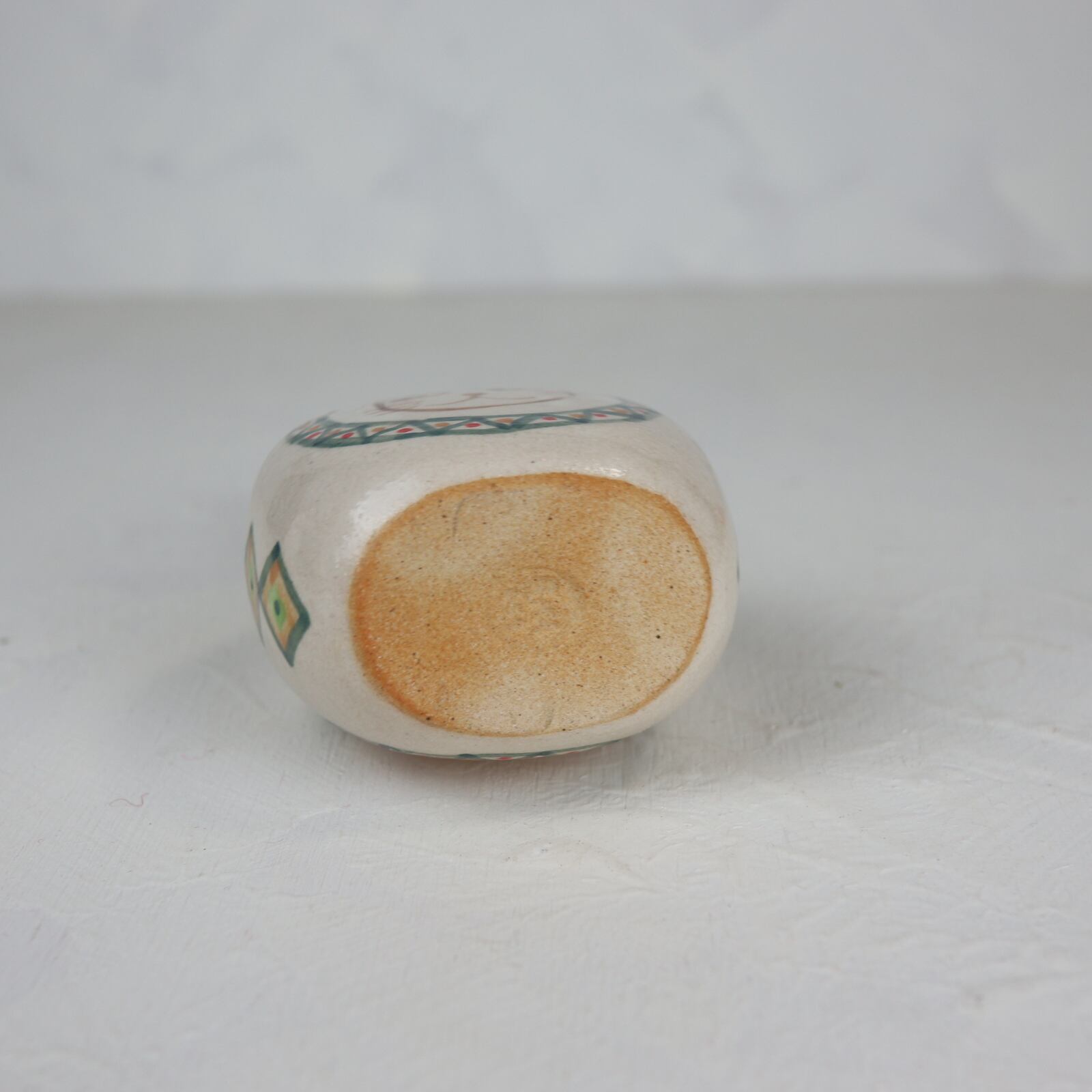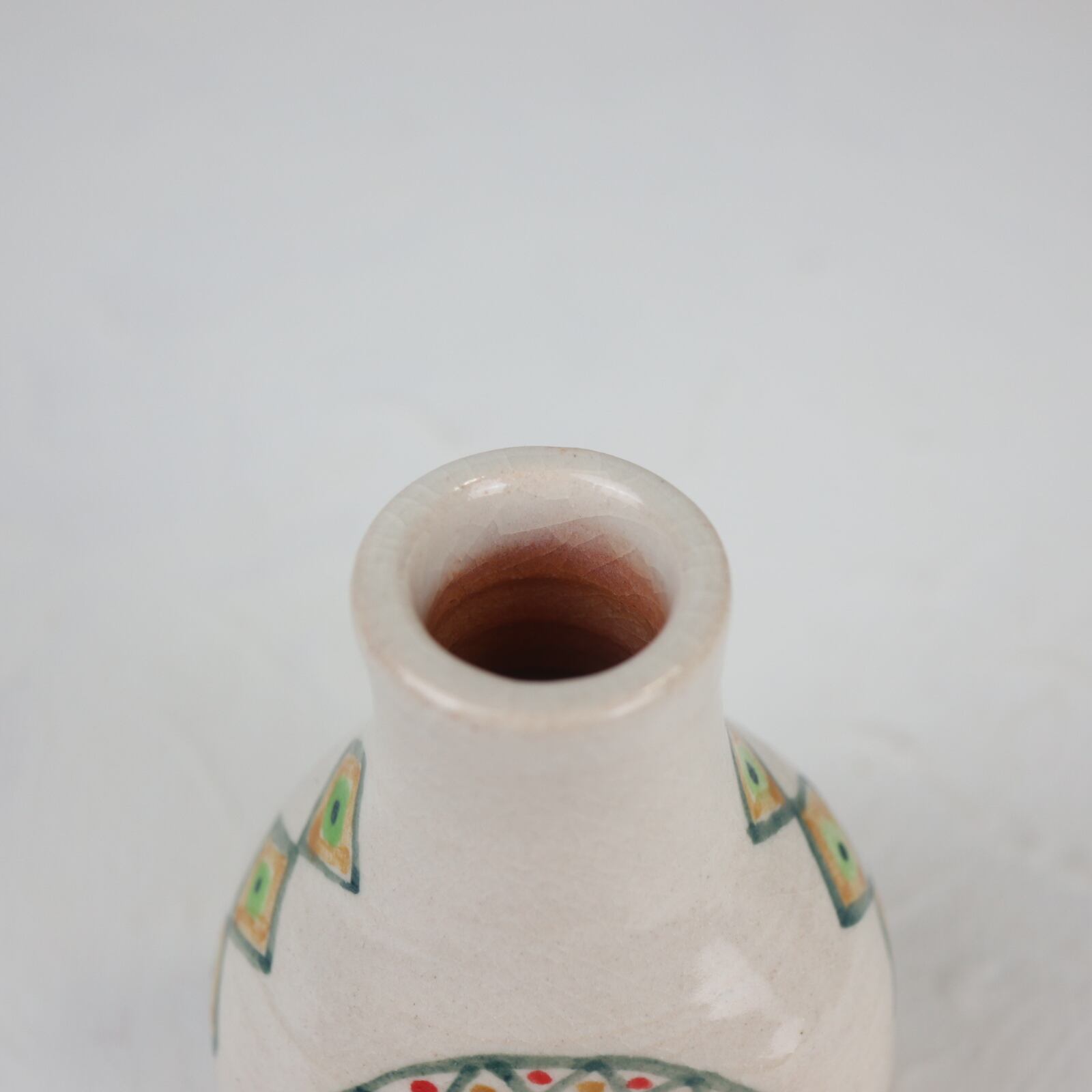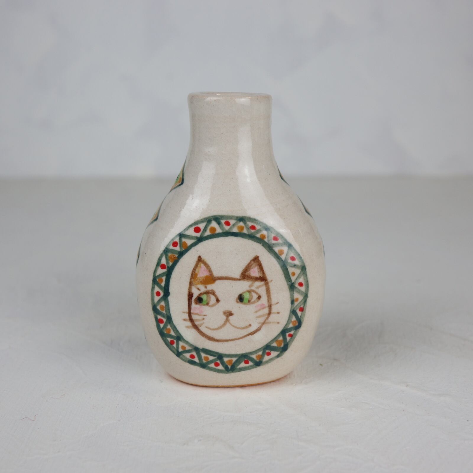 三毛猫の絵付をしたミニ花瓶です。変形してあるので、狭いスペースにも置きやすいです。